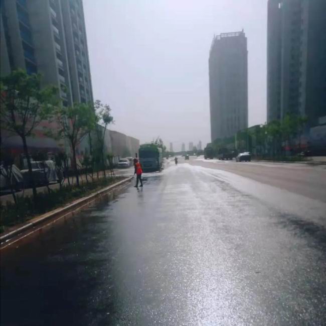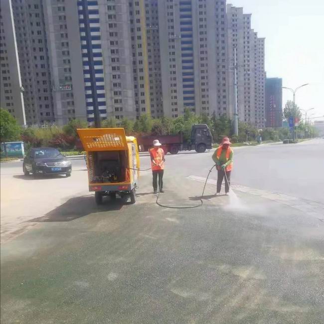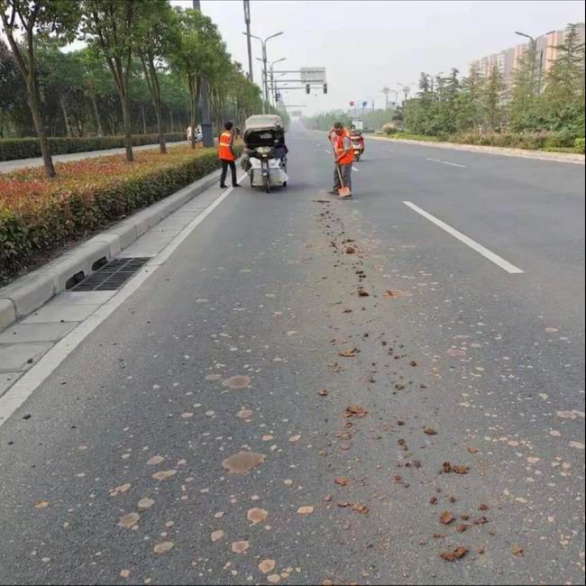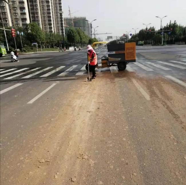 我司先讓灑水車對污染路面進(jìn)行灑水,再用鐵锨和掃帚對污染地面進(jìn)行充分掃刷,隨后用高壓水槍對地面進(jìn)行反復(fù)沖洗。經(jīng)過環(huán)衛(wèi)工人的不間斷努力作業(yè),路面還原了本色。
