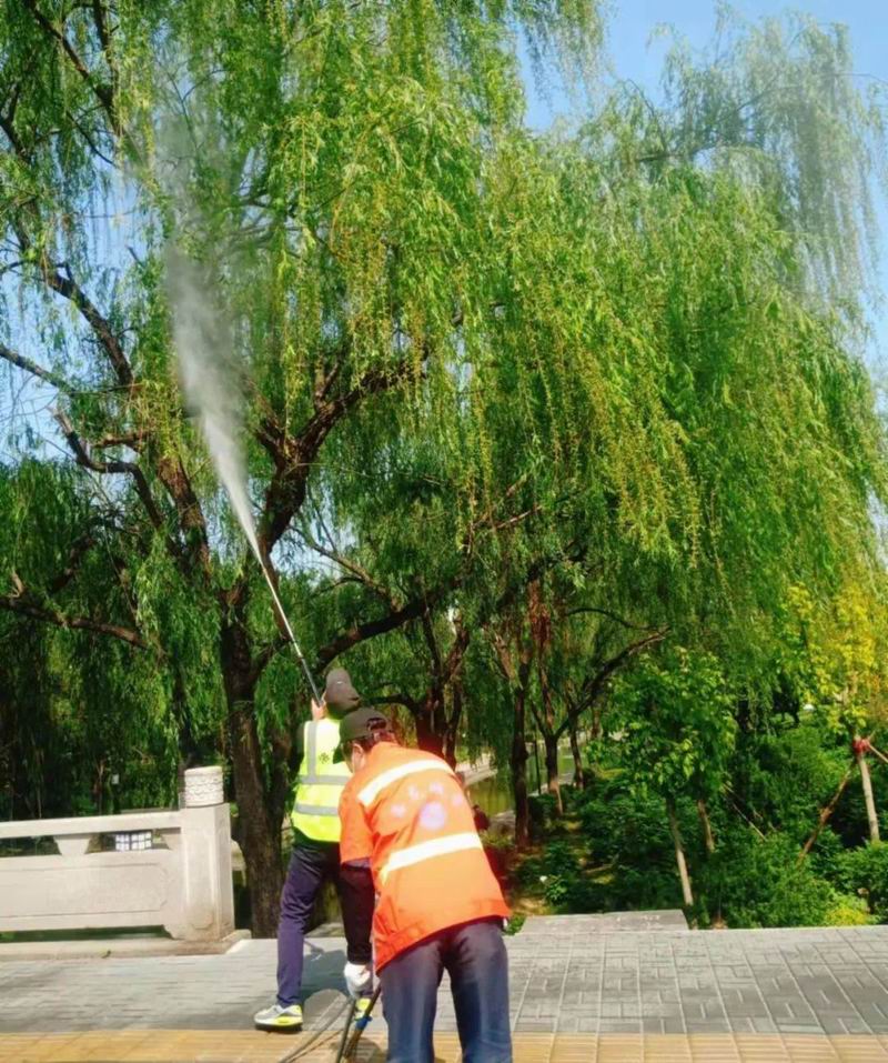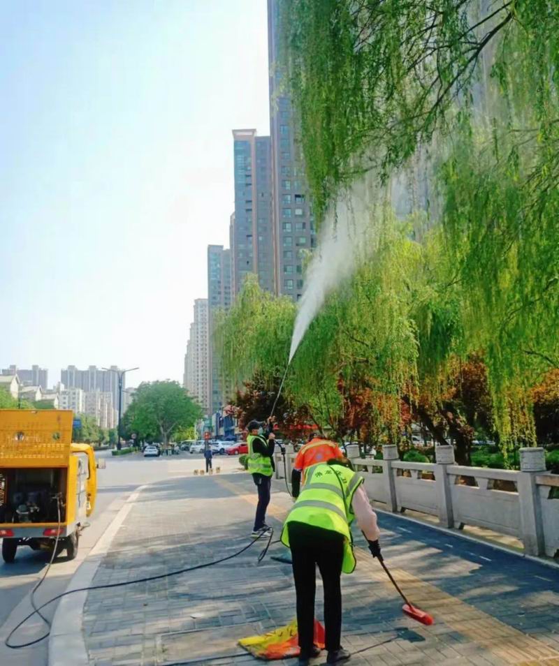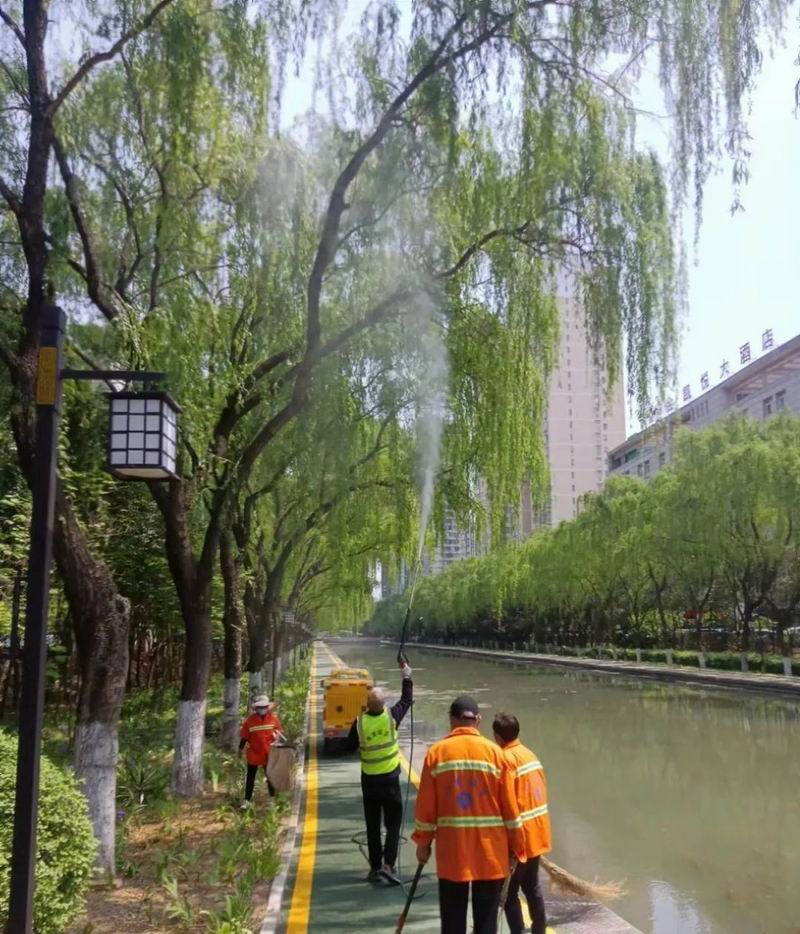 暮春四月,正是楊柳絮紛飛季節(jié),為了盡快清掃城區(qū)主要干道以及楊柳樹密集區(qū)域的楊柳絮,軒潔公司采取“人機(jī)結(jié)合、循環(huán)沖洗、機(jī)掃收集”的方式進(jìn)行降塵除絮作業(yè)。